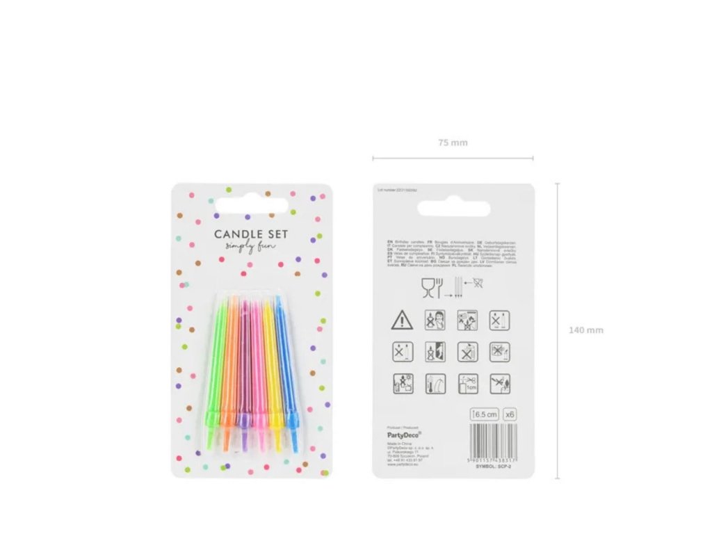 Balení obsahuje 6 svíček a 6 praktických stojánků pro snadné a stabilní zapíchnutí do dortu. Díky výšce cca 6,5 cm svíčky hezky vyniknou, ale nepřebijí celkový vzhled dortu.