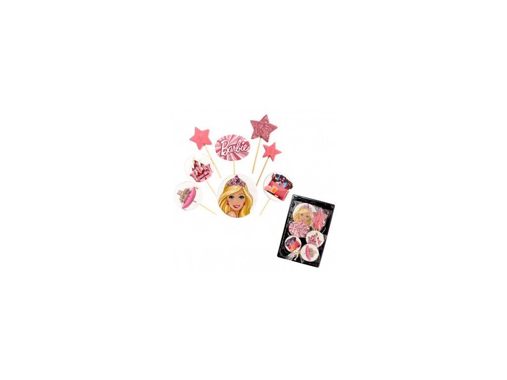 Cukrová dekorace – Barbie sada zápichů je tematická dekorace určená ke zdobení narozeninových dortů, cupcakes a dalších sladkých dezertů. Sada obsahuje motivy inspirované světem Barbie – portrét Barbie, hvězdy, logo Barbie a další dekorativní prvky, které vytvoří krásný dívčí dort.