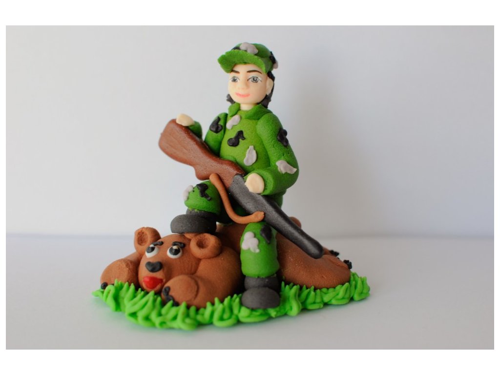 Lovec – Hunter je hotová cukrová dekorace, určená k okamžitému použití na dorty a slavnostní dezerty. Figurka lovce s puškou a ulovenou zvěří je doplněna o trávu a podklad, díky čemuž vytváří kompletní tematickou scénu bez nutnosti dalšího zdobení.