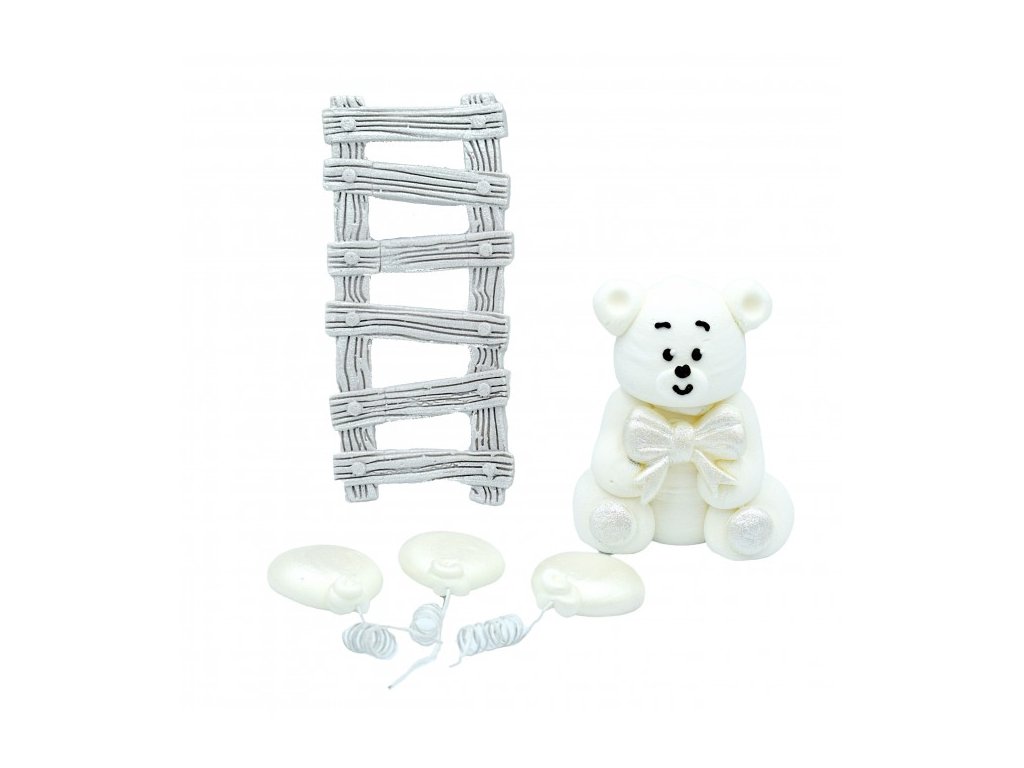 Medvídek s žebříkem je hotová cukrová dekorace, určená k okamžitému použití na dorty a slavnostní dezerty. Balení obsahuje medvídka, žebřík a balónky, díky čemuž snadno vytvoříš kompletní tematickou výzdobu bez dalšího zdobení.