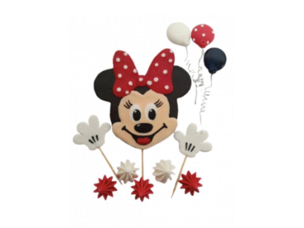Cukrová dekorace – Minnie zápich je tematická ozdoba určená ke zdobení dětských dortů a slavnostních dezertů. Motiv populární postavičky Minnie doplněný o dekorativní prvky a balónky vytvoří veselý a hravý vzhled narozeninového dortu.