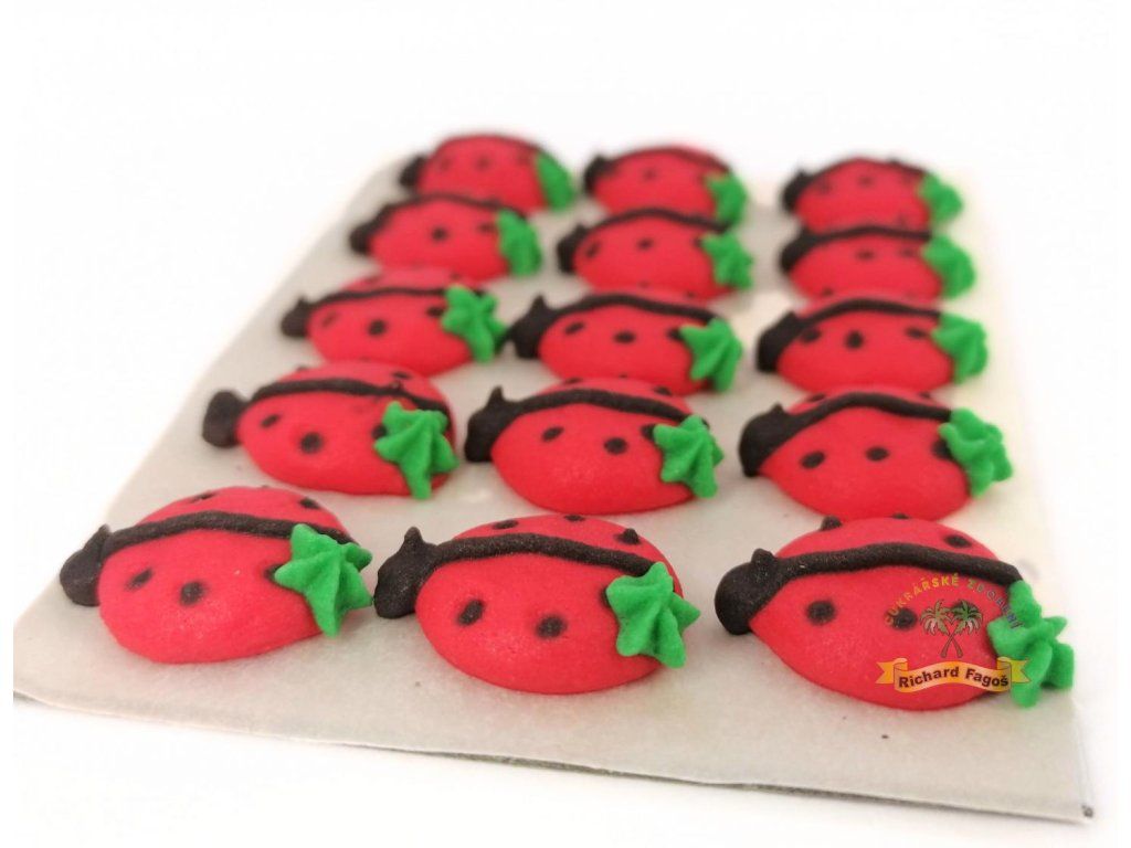 Sytě červené tělo s černými puntíky a zeleným detailem krásně oživí jarní, dětské nebo tematické dorty. Balení obsahuje 15 kusů na platíčku.
