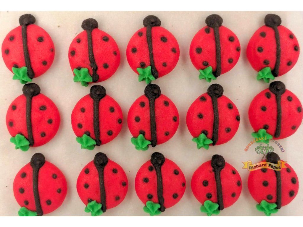 Cukrové dekorace – berušky jsou originální cukrářské zdobení vhodné pro finální dozdobení dortů, cupcakes, minidezertů i slavnostních zákusků. Každá beruška má průměr přibližně 2 cm a je ručně vyráběná, proto se jednotlivé kusy mohou mírně lišit.