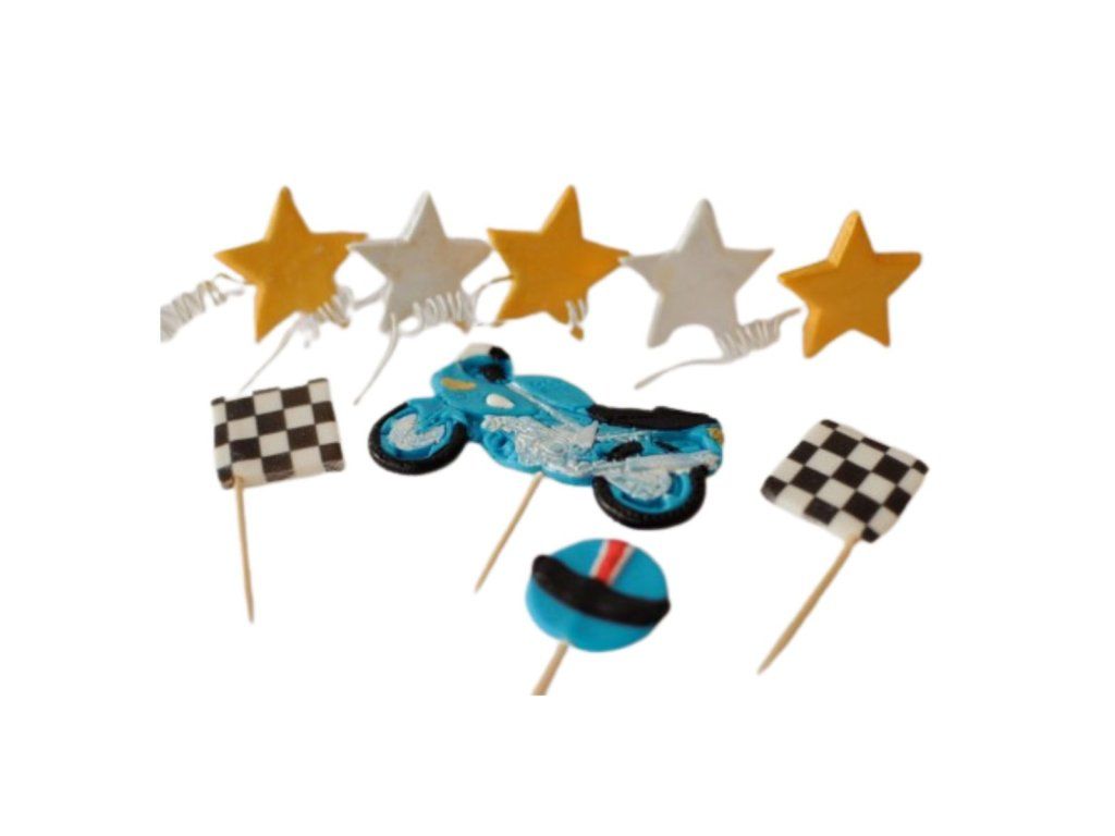 Cukrové dekorace – motorka sada 2D zápichy jsou tematické dortové ozdoby určené k zapíchnutí přímo do dortu nebo cupcakes. Dominantou sady je modrá závodní motorka doplněná šachovnicovými vlaječkami, hvězdami a helmou, které společně vytvoří dynamickou závodní atmosféru.