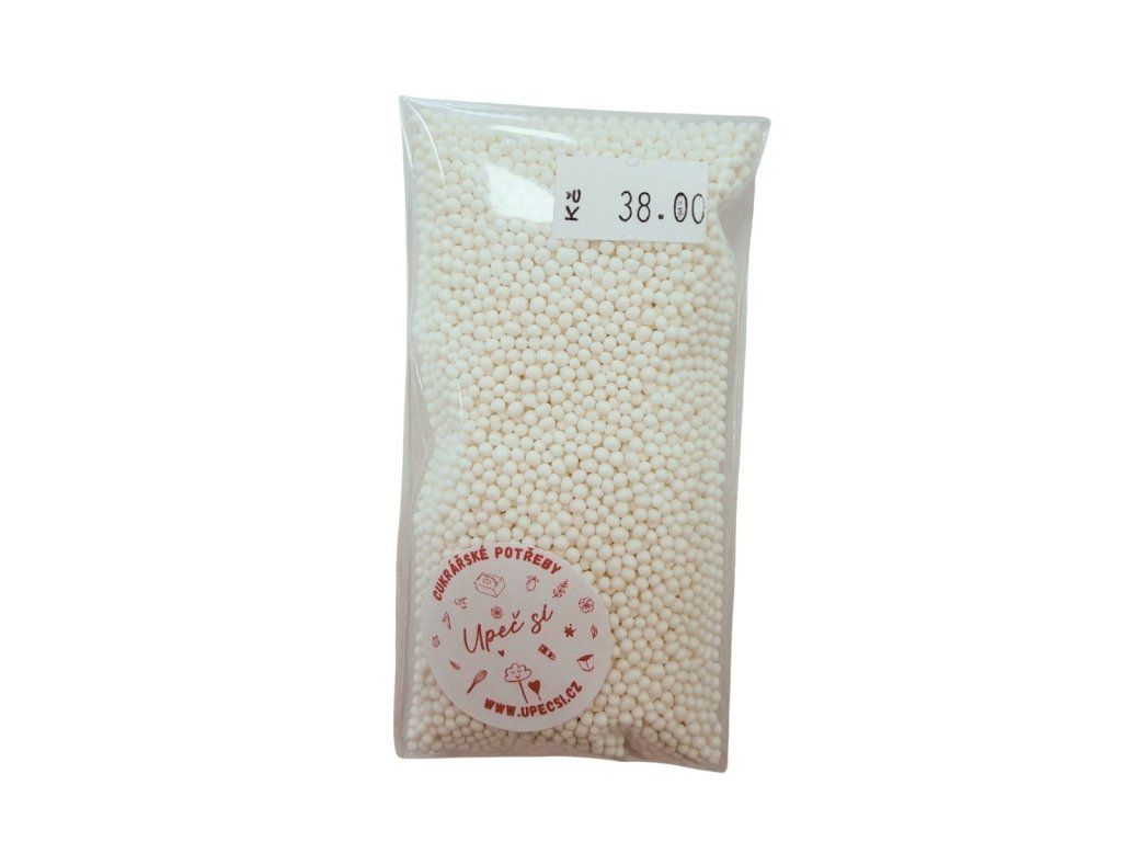 Cukrový máček bílý je dekorativní posyp určený pro finální zdobení sladkých výrobků. Díky drobné velikosti vytvoří na povrchu dezertů jemný efekt, který krásně doplní krémy, polevy i čokoládové dekorace. Skvěle se hodí na svatební, vánoční i slavnostní pečení.