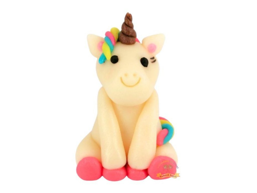 Figurka 3D jednorožec je ručně vyráběná jedlá dekorace z kokosové modelovací hmoty s příchutí sladkých mandlí. Díky 3D provedení, veselému výrazu a barevným detailům (roh, hříva, ocas) se stane nepřehlédnutelným prvkem dortu.