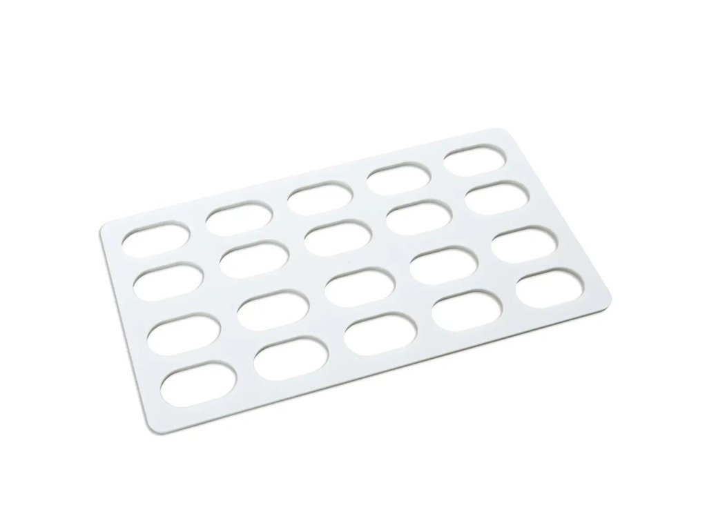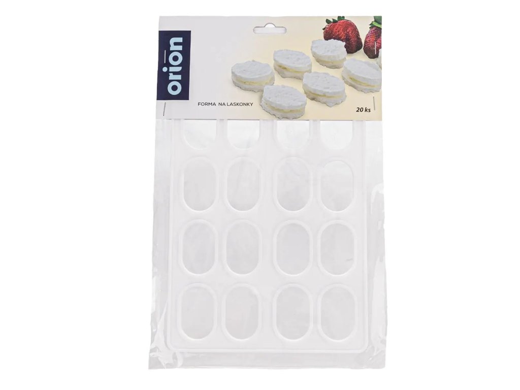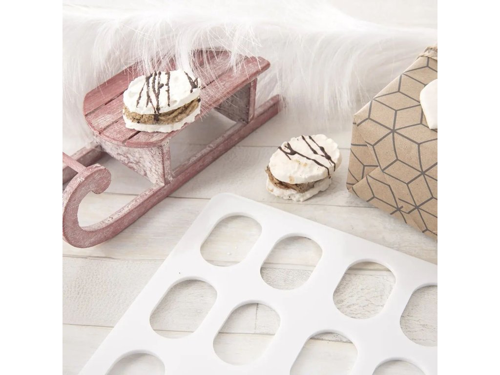 Tato forma na pečení laskonek slouží jako praktická šablona pro přípravu křehkých sněhových laskonek z bílků a cukru. Stačí hmotu rozetřít přes šablonu na pečicí papír, přebytek stáhnout stěrkou, šablonu opatrně sundat a laskonky upéct, respektive usušit v troubě. Výsledkem jsou pravidelné tvary připravené k plnění krémem.