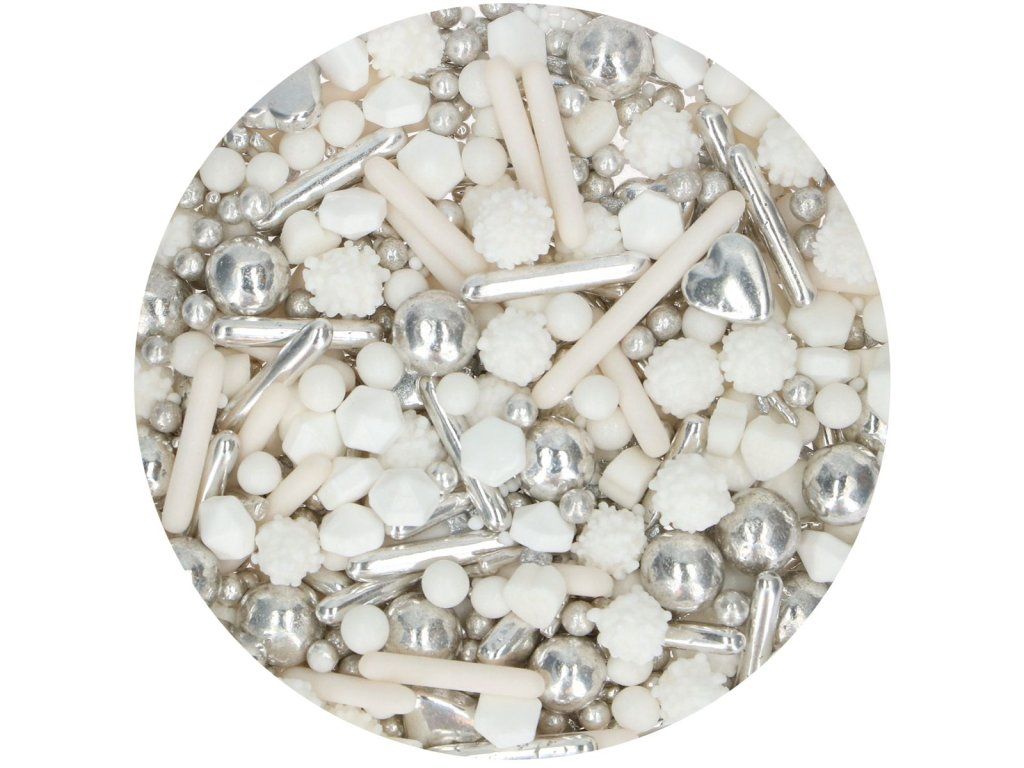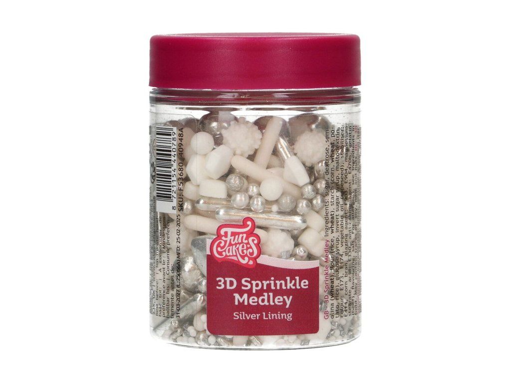 FunCakes 3D Sprinkle Medley – stříbrná podšívka je prémiová směs cukrových posypů, která kombinuje perly, drobné tvary a 3D prvky v elegantním stříbrném ladění. Každá sklenička obsahuje pečlivě namíchaný mix, díky kterému působí zdobení bohatě a originálně bez složité práce.