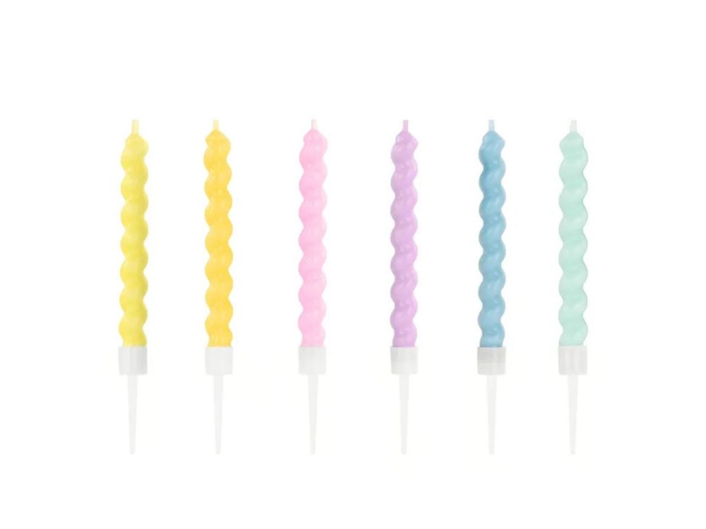 Kroucené narozeninové svíčky, pastelový mix – 8,5 cm přinesou na dort lehkost a radostnou atmosféru. Kombinace šesti pastelových barev (žlutá, růžová, zelená, modrá, oranžová, fialová) působí svěže a skvěle ladí s moderní i klasickou výzdobou.