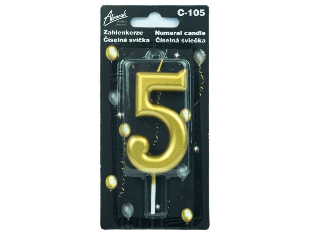 Narozeninová metalická zlatá dortová svíčka – číslo 5