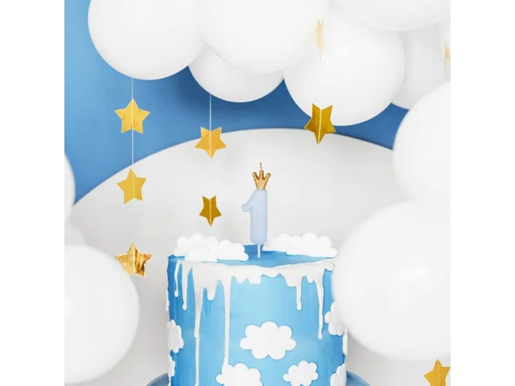 Narozeninová svíčka číslo 1, světle modrá – 9,5 cm je stylový detail, který okamžitě zaujme. Jemný pastelový odstín v kombinaci se zlatou korunkou působí slavnostně a zároveň něžně, takže je ideální volbou pro první narozeniny i tematické oslavy v modrých tónech.