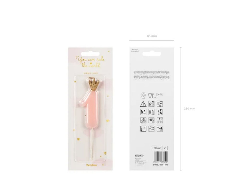 Narozeninová svíčka číslo 1, světle růžová – 9,5 cm je něžný a stylový doplněk narozeninového dortu. Pastelový růžový odstín v kombinaci se zlatou korunkou působí slavnostně a jemně, takže je perfektní volbou pro první narozeniny, baby shower nebo dívčí oslavy.