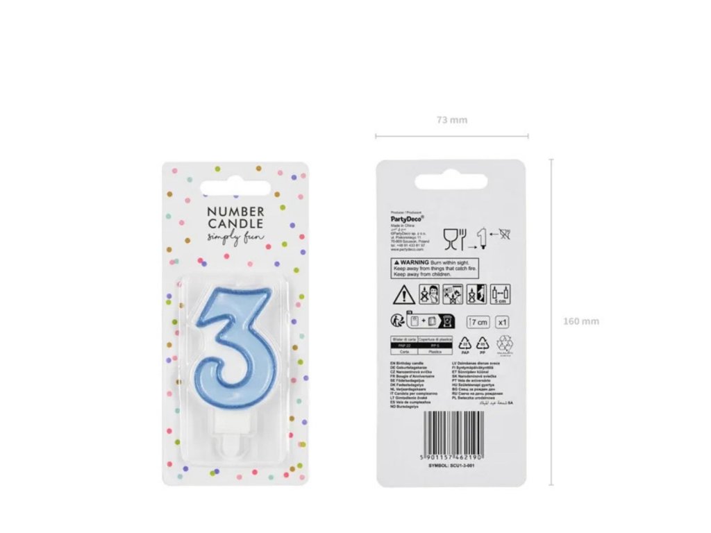 Narozeninová svíčka číslo 3, modrá – 7 cm je univerzálním doplňkem pro dětské i dospělé oslavy. Modrá barva působí svěže a hravě, takže se skvěle hodí především na dětské narozeniny, ale i na tematické oslavy laděné do modrých tónů.