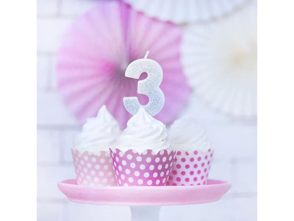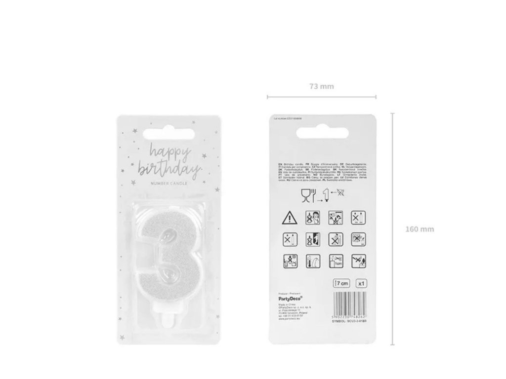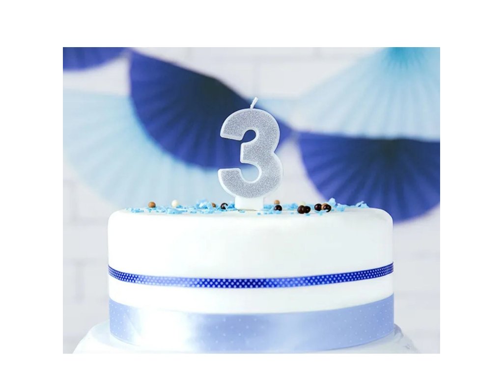 Narozeninová svíčka číslo 3, stříbrná – 7 cm je klasický doplněk pro narozeninové i výroční dorty. Třpytivé stříbrné provedení působí elegantně a snadno se kombinuje s dalšími číselnými svíčkami, pokud vytváříš vícemístné číslo.