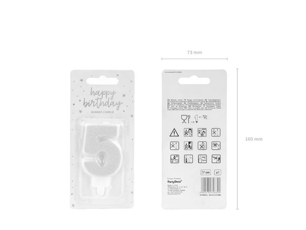 Narozeninová svíčka číslo 5, stříbrná – 7 cm je klasickým a univerzálním doplňkem pro narozeninové i výroční dorty. Třpytivé stříbrné provedení působí elegantně a snadno se kombinuje s dalšími číselnými svíčkami, pokud vytváříš vícemístné číslo.