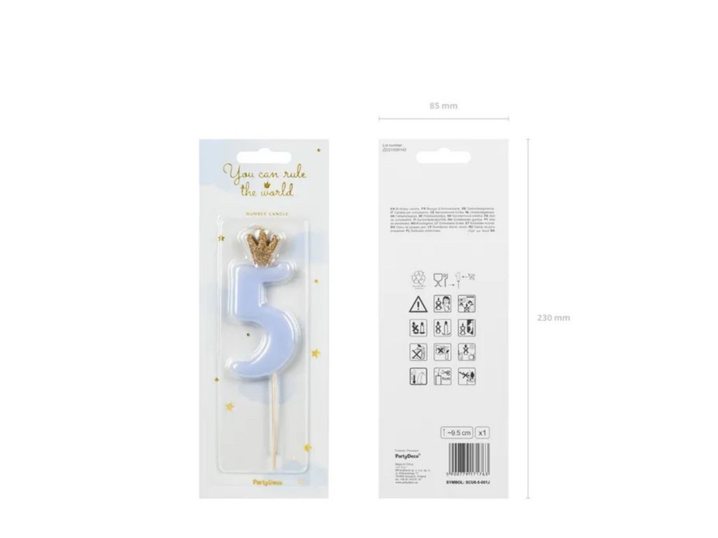 Narozeninová svíčka číslo 5, světle modrá – 9,5 cm je stylový detail, který na dortu okamžitě zaujme. Jemný pastelový odstín v kombinaci se zlatou korunkou působí slavnostně a něžně, takže je ideální volbou pro páté narozeniny i tematické dětské oslavy.