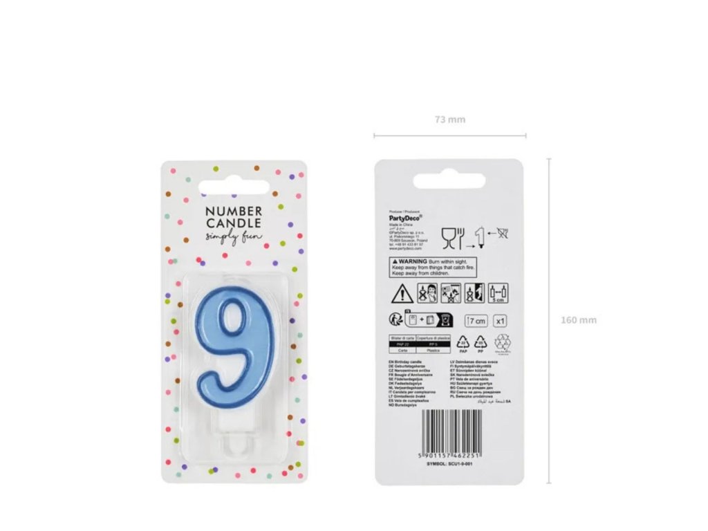 Narozeninová svíčka číslo 9, modrá – 7 cm je univerzálním doplňkem pro dětské i dospělé oslavy. Modrá barva působí svěže a hravě, proto se skvěle hodí zejména na dětské narozeniny, ale i na tematické oslavy laděné do modrých tónů.