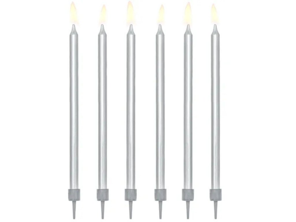 Narozeninové svíčky jednobarevné, stříbrné – 12,5 cm jsou nadčasovou dekorací, která se hodí ke klasickým i moderním dortům. Stříbrný metalický odstín působí čistě a elegantně a snadno se kombinuje s jakoukoli barevnou výzdobou.