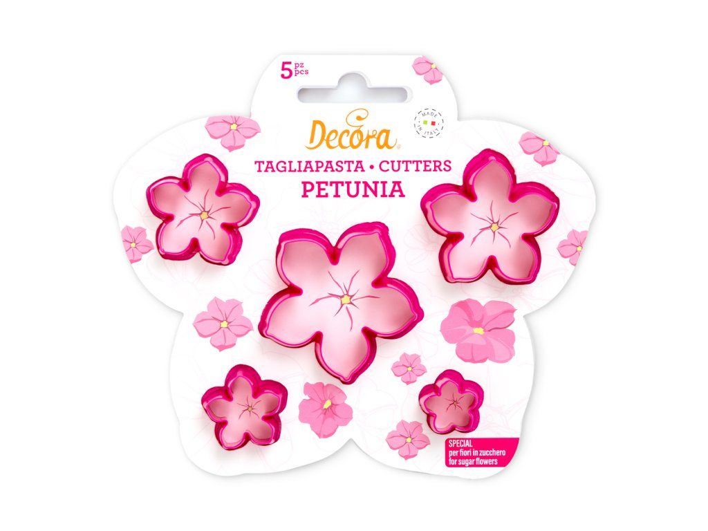 Plastová vykrajovátka petúnie – sada 5 ks od značky Decora je skvělou pomůckou pro všechny, kdo chtějí vytvářet jemné květinové dekorace na dorty a dezerty. Sada obsahuje pět různých velikostí květů (2–6 cm), díky kterým snadno vytvoříte realisticky vypadající květinové kompozice.
