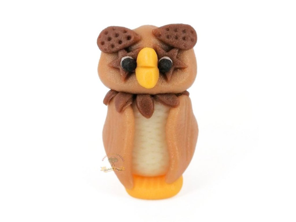 Příležitostná postavička sova je jedlá dekorace z kokosové modelovací hmoty s příchutí sladkých mandlí. Oproti velkým 3D figurkám má subtilnější provedení a menší hmotnost, díky čemuž se skvěle hodí na menší dorty, řezy, cupcakes i zákusky.