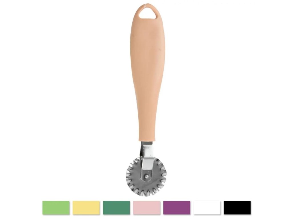 Rádýlko má kovové kolečko a plastovou rukojeť, která dobře padne do ruky. Na konci rukojeti se nachází praktické očko pro zavěšení, takže ho můžeš mít vždy po ruce. Průměr kolečka je přibližně 3–3,3 cm, což je ideální velikost pro běžné kuchyňské použití.