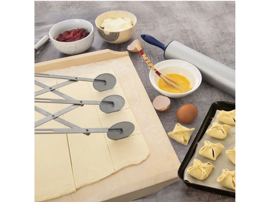 Toto nastavitelné cukrářské trojité rádýlko je praktickým nástrojem pro snadné krájení a značení vyváleného těsta. Díky třem hladkým řezným kolečkům z nerezové oceli vytvoříš během několika tahů pravidelné proužky nebo čtverce se stejnou šířkou.